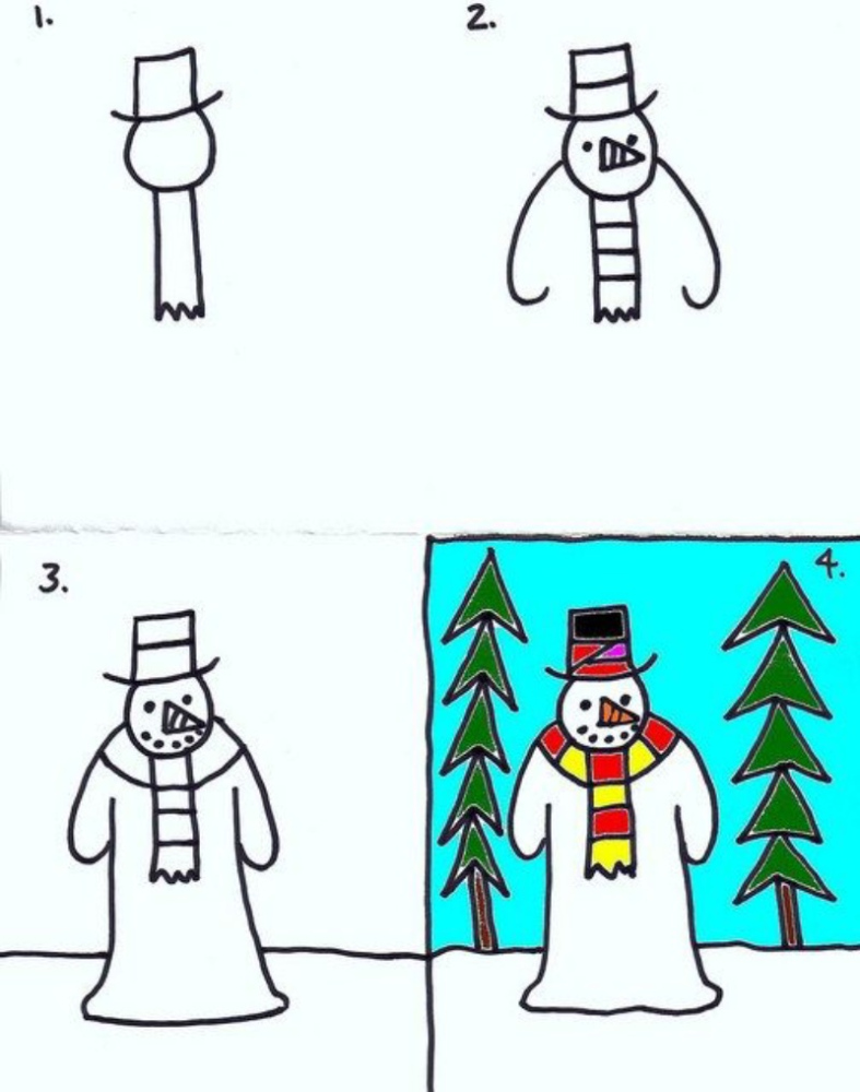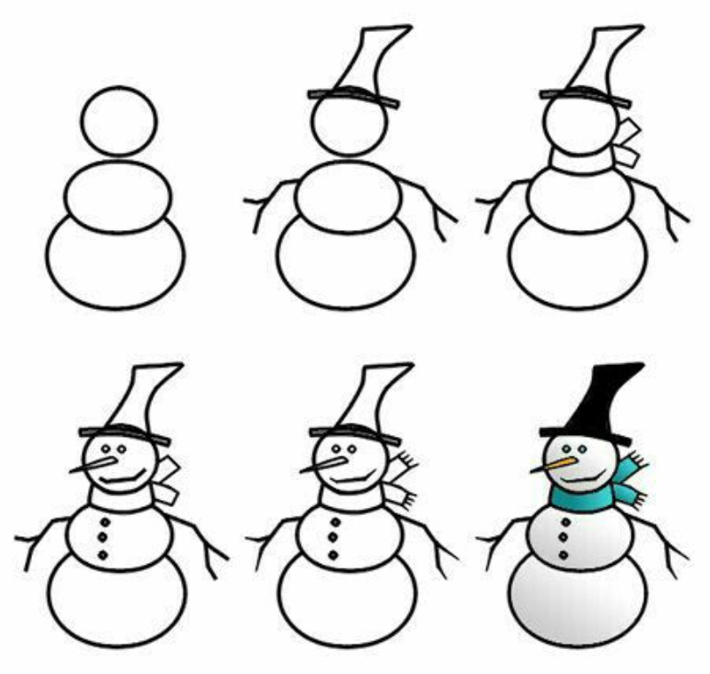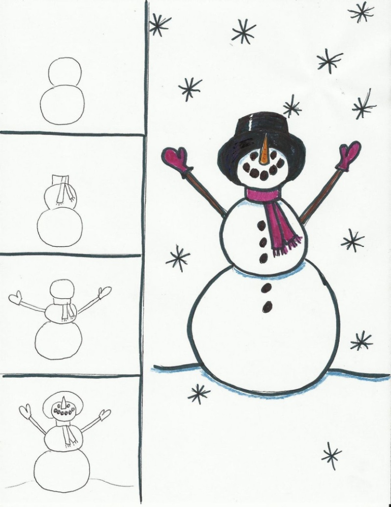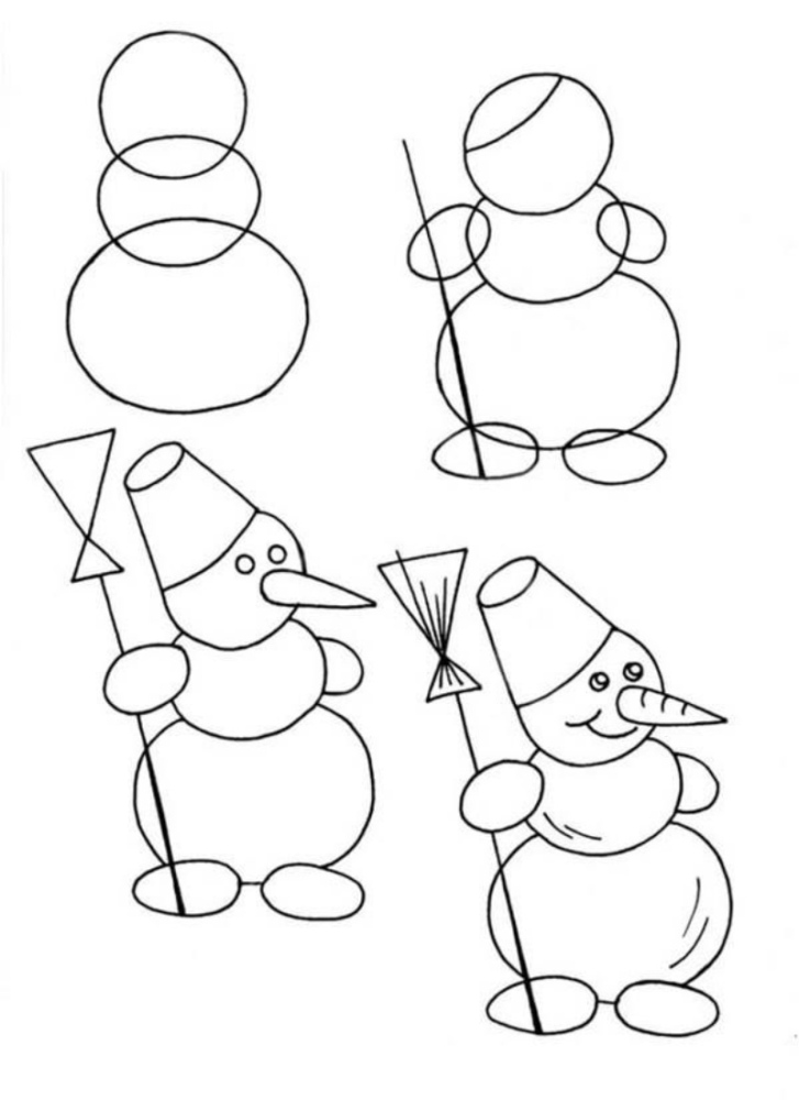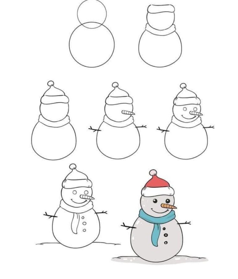 Зимові дні асоціюються зі святами, іграми в снігу та затишком. Малеча із задоволенням бере в руки олівці й створює святкові зображення. Простий сніговик малюнок часто стає першою темою для творчості в садочку та початковій школі. Цей образ знайомий кожному дитинству: три кулі, морквина замість носа, шарф і відро замість капелюха. Малювати його легко, тому малюнки виходять навіть у тих, хто тільки починає вчитися тримати олівець.