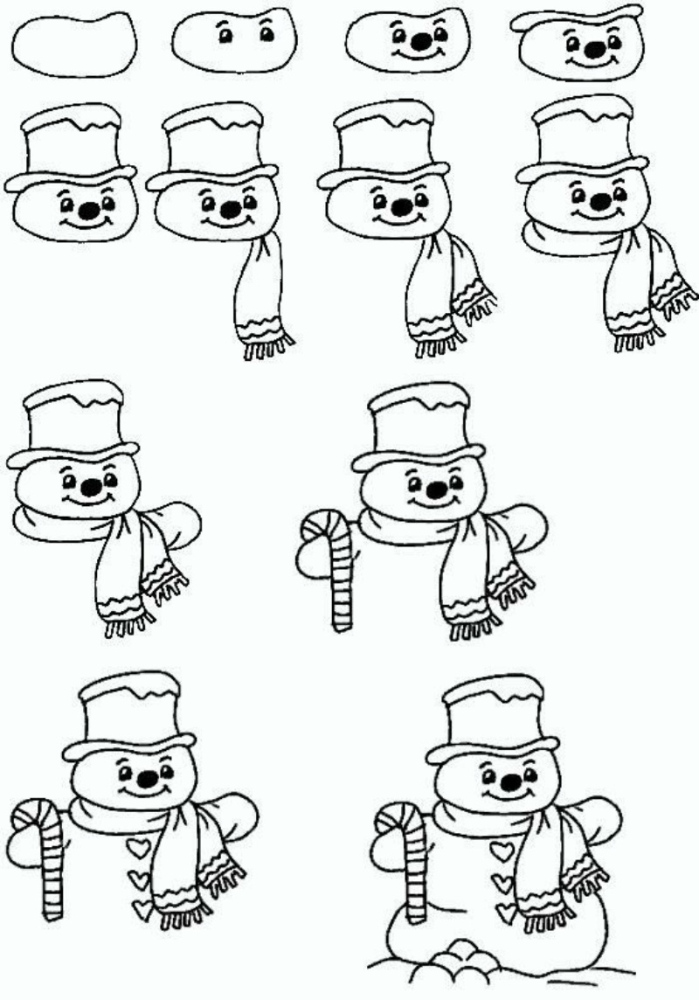Наприклад, поруч із героєм може стояти ялинка, лежати подарунки або бігати кумедні звірята. Новорічні малюнки сніговик із такими сюжетами виглядають дуже живо, а дитині набагато цікавіше завершувати малюнок, коли є історія.