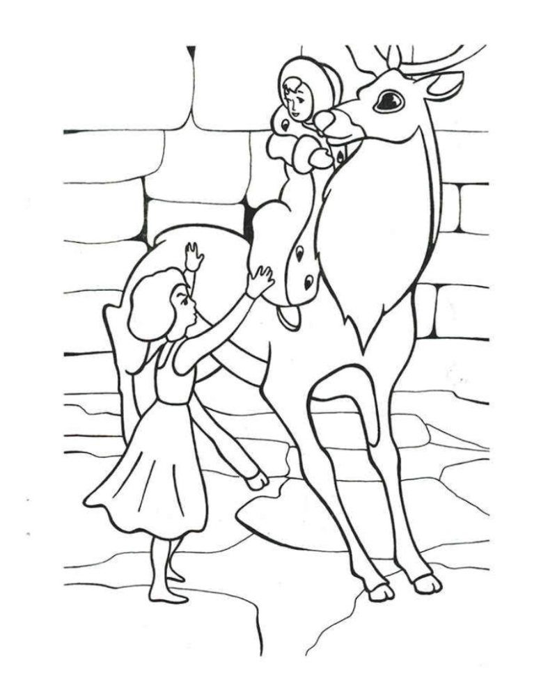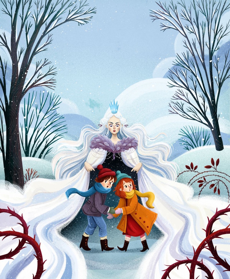 Герда постійно долає відстані та перешкоди. Рух її одягу, спрямовані вперед руки, тварини або друзі поруч допомагають підкреслити її рішучість. У таких ілюстраціях доречні теплі акценти кольору, які контрастують зі снігом та льодом навколо.
