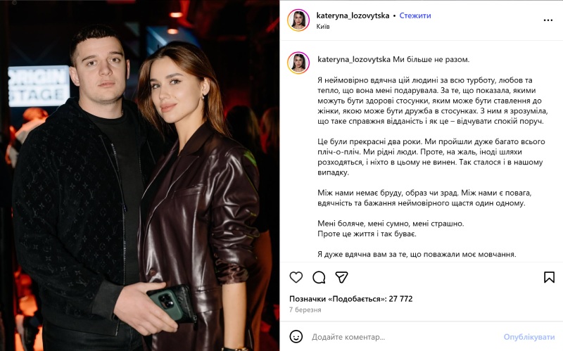 Свої рішення вона не приховує й ділиться думками у медіа. Саме тому Катерина Лозовицька особисте життя сприймається без скандальності, як природна частина її розвитку. Вона каже, що відносини навчили її повазі, довірі та цінуванню власних меж.