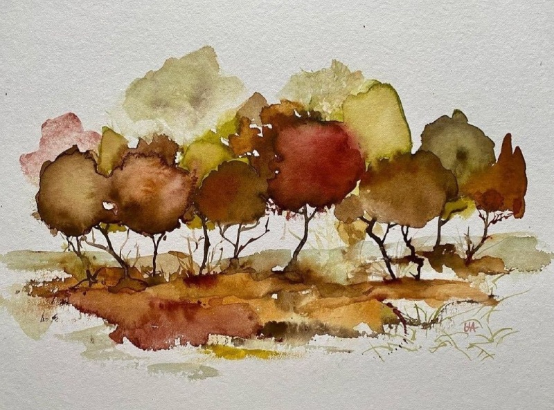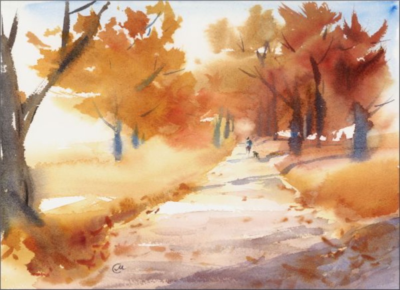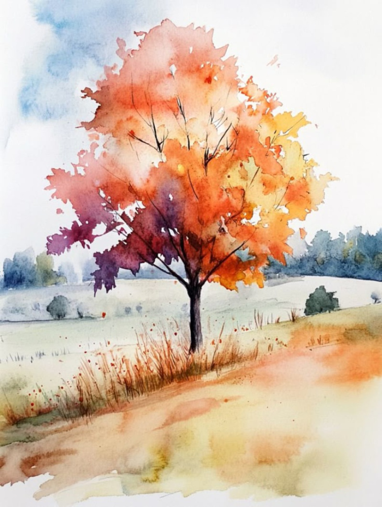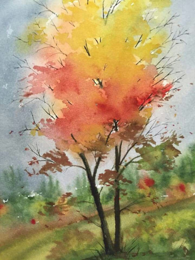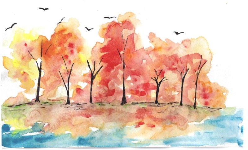Осінній пейзаж аквареллю вирізняється м’якими переходами. Вода допомагає отримати розмиті краї, завдяки чому сцена виглядає повітряною.