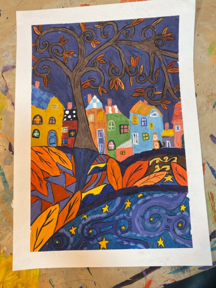 Фарби додають виразності та об’єму. Осінній пейзаж фарбами розкриває глибину кольорів: теплі відтінки неба, м’які переходи між листям, яскраві акценти ягід чи ліхтарів. Гуаш дає щільні насичені мазки. Важливо працювати від великих кольорових плям до дрібних деталей, щоб малюнок виглядав гармонійно.