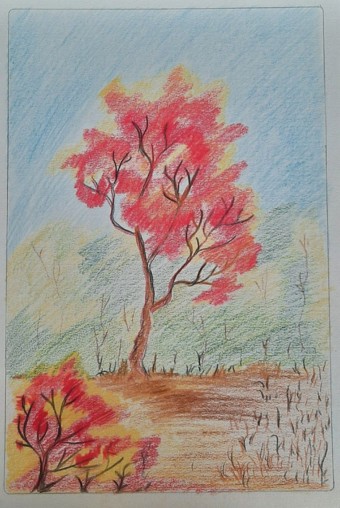Найзручніше почати з ескізу. Для цього варто легкими лініями позначити горизонт, розташування дерев і доріжок. Осінній пейзаж олівцем дає змогу поступово вибудовувати композицію й легко виправляти деталі. У початкових класах діти часто роблять пейзаж осінь малюнок з двома деревами, доріжкою та опалим листям – така сцена проста, але виразна.